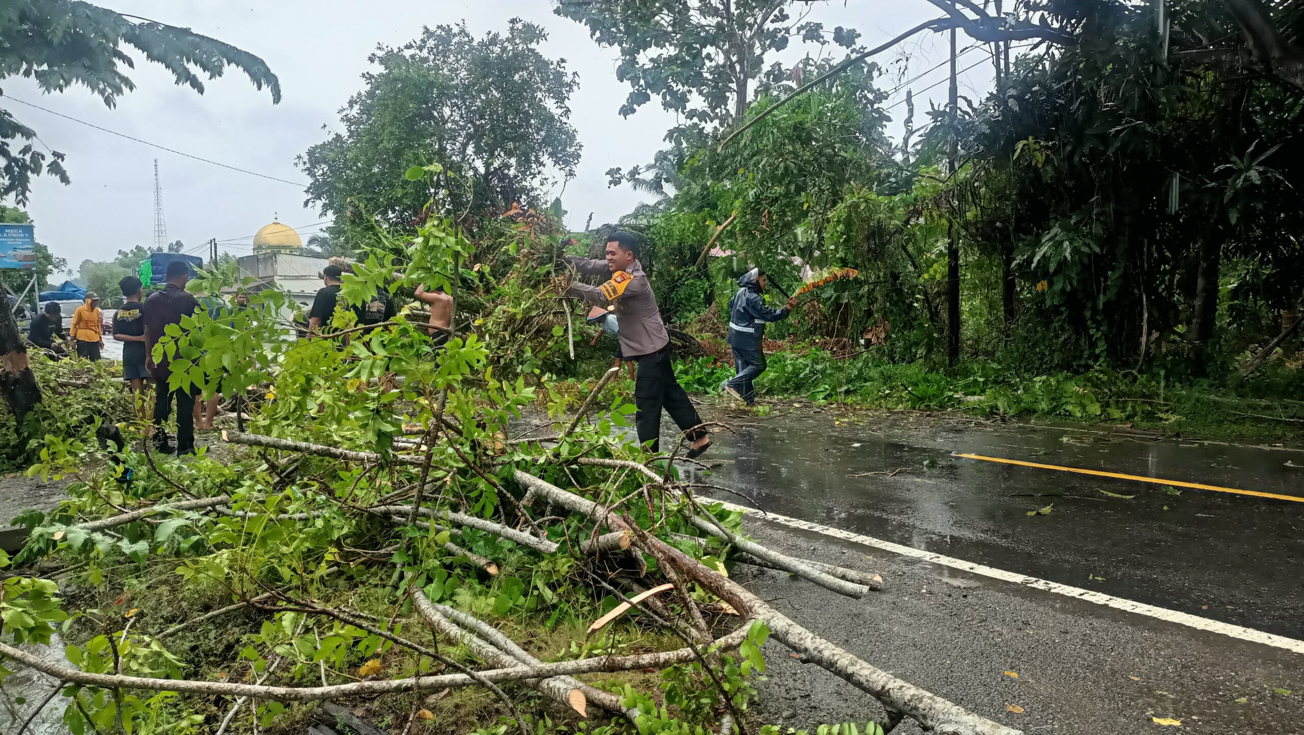 Pohon tumbang tersebut sempat menghambat arus lalu lintas dan berpotensi menimbulkan kecelakaan bagi para pengguna jalan. Dengan sigap, AIPDA Hamdani bersama warga setempat melakukan evakuasi dengan memotong dan memindahkan batang serta ranting pohon yang menutup akses jalan.