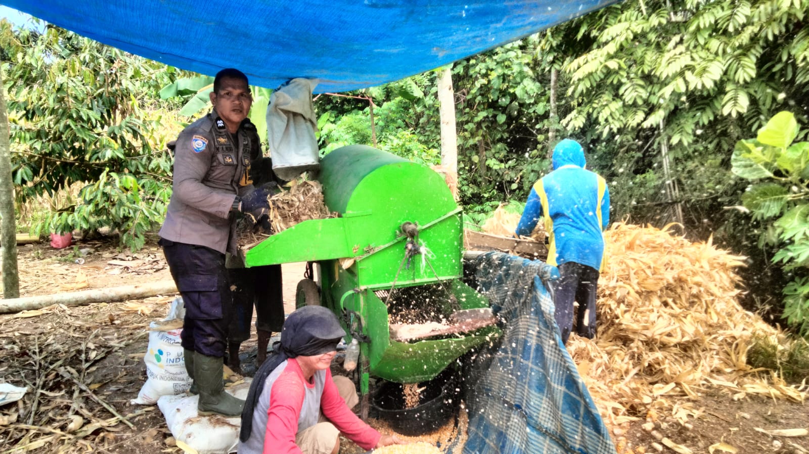Kegiatan tersebut berlangsung di kebun milik Bapak Darwis L, warga Dusun Towoni II, Desa Towoni, Kecamatan Baras, Kabupaten Pasangkayu. Bhabinkamtibmas Polsek Baras AIPFA Muhammad Arafah turut terjun langsung membantu warga dalam proses perontokan jagung hasil panen sebagai bentuk pendampingan dan dukungan nyata Polri terhadap sektor pertanian masyarakat.