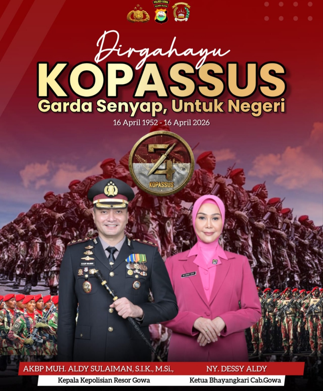 Divisinews.com//Gowa,- Kapolres Gowa AKBP Muhammad Aldy Sulaiman, S.I.K, M.Si bersama Ketua Bhayangkari Cabang Gowa, Ny. Dessy Aldy, menyampaikan ucapan Dirgahayu ke-74 kepada Komando Pasukan Khusus (KOPASSUS) yang diperingati pada 16 April 2026.