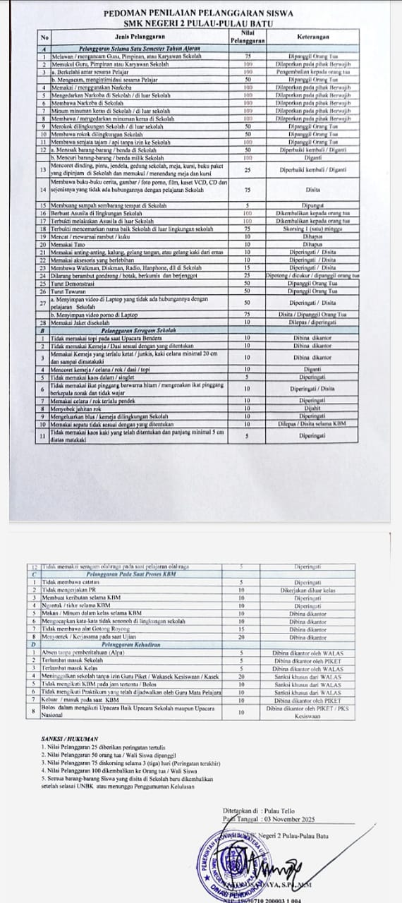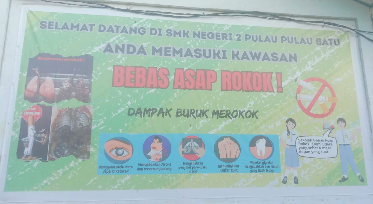 Divisinews.com-Nisel, Kedisplinan atau peraturan di sekolah SMK Negeri 2 Pulau-pulau Batu Kabupaten Nias Selatan sangat ketat dan displin, salah satu nya ada nya Larangan merokok atau lokasi sekolah tersebut adalah kawasan bebas asap rokok, di mana di lokasi sekolah tersebut siapa pun dia dan jabatan apapun termasuk bapak ibu guru ter istimewah kepada siswa/i semua nya tidak di ijingkan untuk merokok di wilayah sekolah, ber dasar kan peraturan per mendikbud nomor 64-2015 dengan tujuan utama menciptakan lingkungan sekolah yang bersih,sehat dan bebas dari asap rokok. Ucap Kepala Sekolah (FATOLOSA DAYA S.pd,MM).