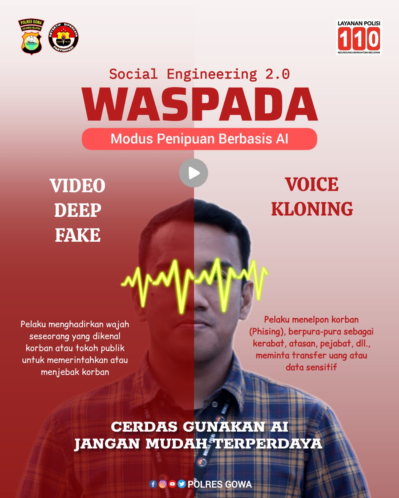 Divisinews.com//Gowa,- Polres Gowa mengimbau masyarakat untuk meningkatkan kewaspadaan terhadap perkembangan modus kejahatan siber terbaru yang dikenal sebagai Social Engineering 2.0, yakni penipuan berbasis kecerdasan buatan (Artificial Intelligence/AI) melalui teknologi video deepfake dan voice cloning, Kamis (01/3/2026).