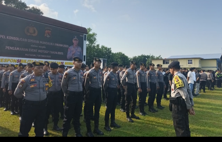 Divisinews.com//Lombok – Polda Nusa Tenggara Barat (NTB) menggelar Apel Konsolidasi Operasi Mandalika Rinjani 2025 usai dilaksanakannya pengamanan perhelatan akbar Pertamina Grand Prix of Indonesia (MotoGP) 2025. Ajang tersebut berlangsung dari 3 hingga 5 Oktober di Sirkuit Mandalika.