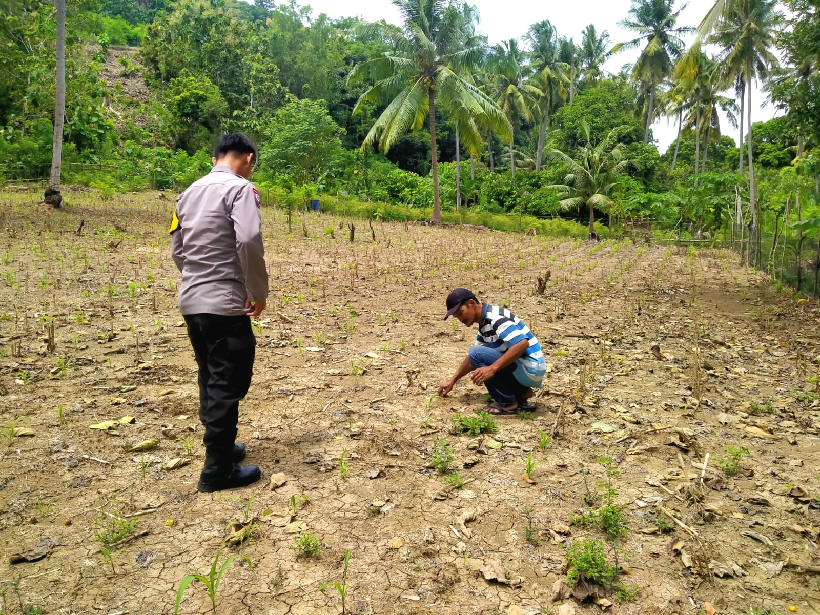 Dalam kegiatan tersebut, AIPTU Ichsan turun langsung ke lokasi lahan pertanian untuk melihat kondisi pertumbuhan tanaman jagung sekaligus berdialog dengan para petani. Ia memberikan motivasi serta dorongan kepada para anggota kelompok tani agar terus merawat tanaman dengan baik sehingga hasil panen nantinya dapat maksimal.