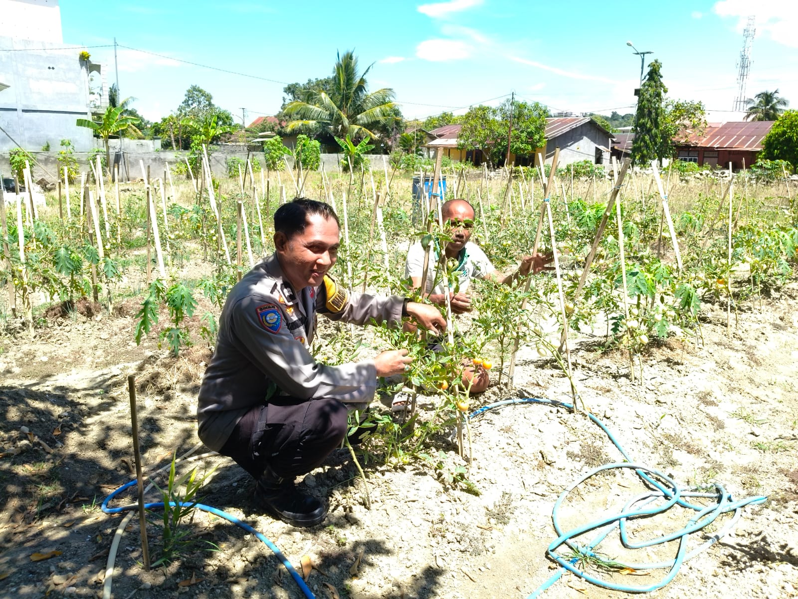 Dalam kegiatan tersebut, AIPTU Burhanuddin meninjau langsung kondisi lahan pekarangan yang dimanfaatkan secara produktif oleh warga dengan menanam tanaman hortikultura jenis tomat. Tanaman tersebut tampak tumbuh subur dan kini telah memasuki masa panen, menjadi bukti nyata keberhasilan pemanfaatan lahan pekarangan untuk mendukung kebutuhan pangan keluarga.