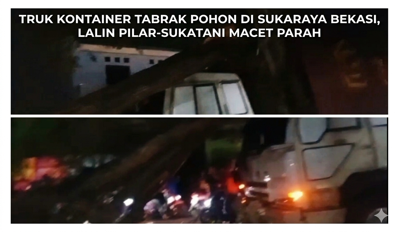 Karang Bahagia – Sebuah truk kontainer menabrak pohon peneduh di Jalan Raya Pilar-Sukatani, Desa Sukaraya, Kecamatan Karang Bahagia, Kabupaten Bekasi, pada Rabu (1/4/2026) malam. Insiden ini mengakibatkan pohon tumbang ke tengah jalan hingga memicu kemacetan panjang di kedua arah.