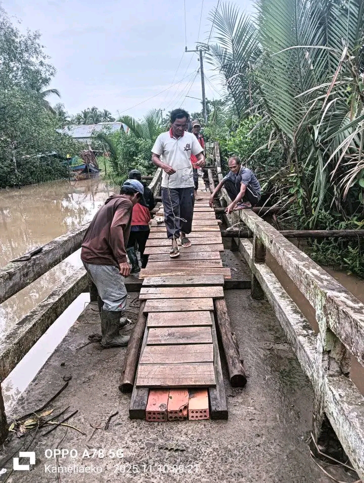Divisinews.Com // Banyuasin – Desa Tanjung Mas Kecamatan Makarti jaya Kabupaten Banyuasin Sumatera Selatan melaksanakan kegiatan gotong royong memperbaiki Jembatan yang rusak di parit 12 yaitu jembatan lintas umum yang berada di wilayah Desa Tanjung Mas. Kegiatan gotong royong yang inisiasi dan laksanakan oleh Warga sekitar jembatan parit 12 di wilayah Desa Tanjung Mas tersebut dilaksanakan pada Senin (10/11/2025).