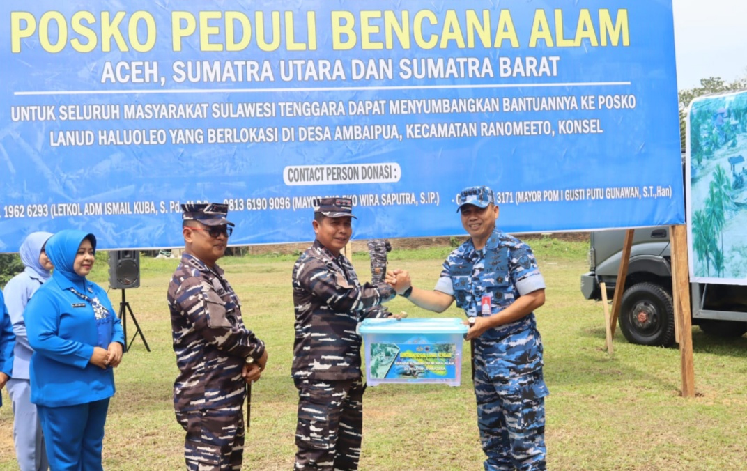 Di bawah langit mendung Lanud Halu Oleo yang diselimuti nuansa keprihatinan, prosesi penyerahan bantuan berlangsung khidmat, dihadiri unsur Forkopimda dan personel TNI AL yang berdiri tegap dalam semangat pengabdian.