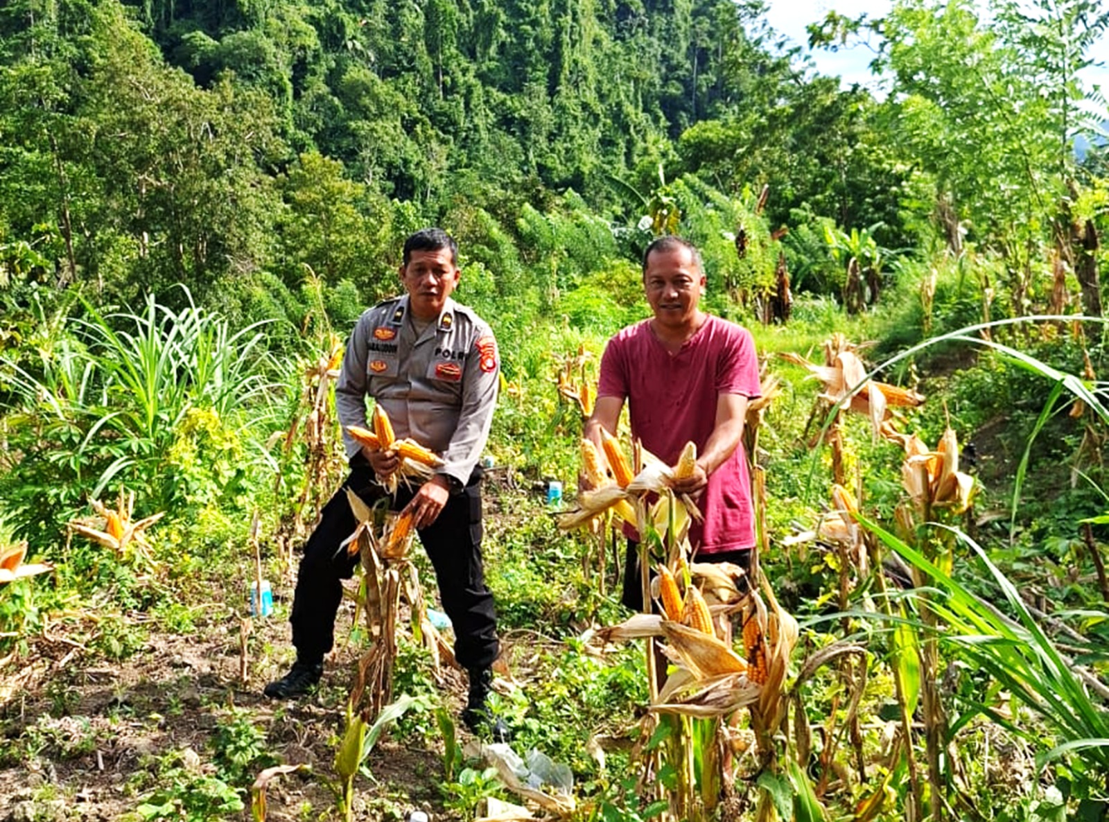 Di sela-sela peninjauan, Ipda Jamaluddin berdialog langsung dengan para anggota kelompok tani guna mengetahui perkembangan tanaman jagung, mulai dari proses penanaman hingga perawatan.